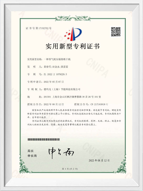Sušička absorbující spotřeba vzduchu s nulovou spotřebou vzduchu - patentový certifikát pro model užitkového modelu