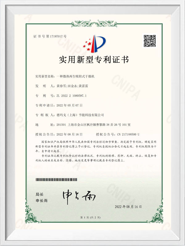 Patentový certifikát modelu modelu Utility Utility pro regenerační adsorpci mikro-terem