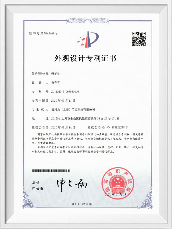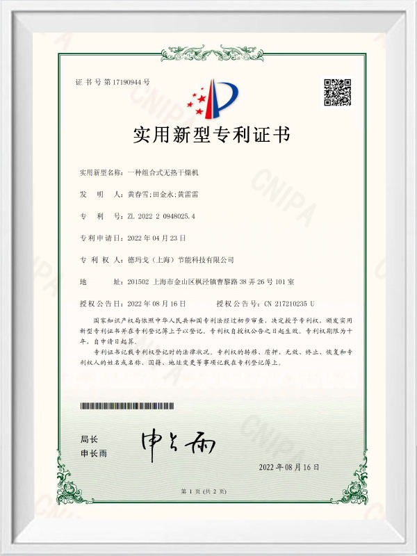Patentový certifikát modelu s vysokým tlakem tepelného sacího sušičky