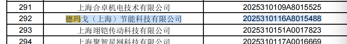 Mezi vybranými společnostmi Demargo (Shanghai) Energy Saving Technology Co., Ltd. byl úspěšně uveden, s registračním kódem 2025310116A8015488 .